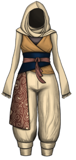 Lulaire's pants and shawl are made out of aged linen. The age and constant washing had helped develop the linen fabric to shift from rough and stiff to soft and gentle. She chose this fabric due to her upbringing in Selen, which was a tropical planet. Linen was known to be a good choice for a breathable fabric during high humidity. The pants are generally a bit baggy, granting the Jedi less restriction in her movements. Her sleeveless top was still made out of linen but also combined with cotton, which helps maintain its softness as well as keep her slightly warm in her new climate on Kasiya. Around her waist was a dark blue silk that reminded her of the ocean, along with a thin coral colored ribbon that's wrapped on top of the silk.