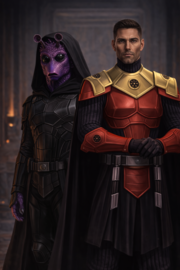 Kamjin "Maverick" Lap'lamiz (Green) beginning his training under Sith Battlemaster Wrath (Purple) {{fairuse}}